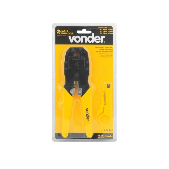 VONDER - ALICATE CRIMP AC-245 P/ RJ11/12/45Alicate 3 em 1, pois serve para conectores de 4, 6 e 8 pinos.Indicado para desencapar, cortar e crimpar fios de rede lógica e telefone. Utilizar em terminais RJ 45/8 pinos (rede lógica), RJ 12/6 pinos e RJ 11/4 pinos (telefone). Capacidade de corte 8P8C/RJ 45: 6 mm², 6P6C/RJ 12: 3 mm² e 4P4C/RJ 11: 3 mm². Aplicável para cortar fios flexíveis de 5 mm² - 6,2 mm².Detalhes Técnicos