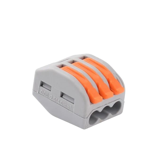 O conector wago de 3 vias permite a ligação de até três fios em uma única conexão. É ideal para ligações simples onde há necessidade de conectar três pontos, garantindo uma fixação firme e segura. Ele possui uma alavanca que facilita o encaixe dos fios e oferece uma boa resistência a desconexões acidentais.