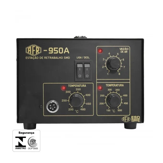 A Estação Dupla AFR é ideal para quem trabalha com eletrônica e necessita de uma estação específica para ressoldagens e troca de componentes SMD e PTH. Sendo 2 em 1 ela possui controle de temperatura no canhão de ar (para SMD) e controle de temperatura no ferro de solda (para PTH). Possui certificado do Inmetro.