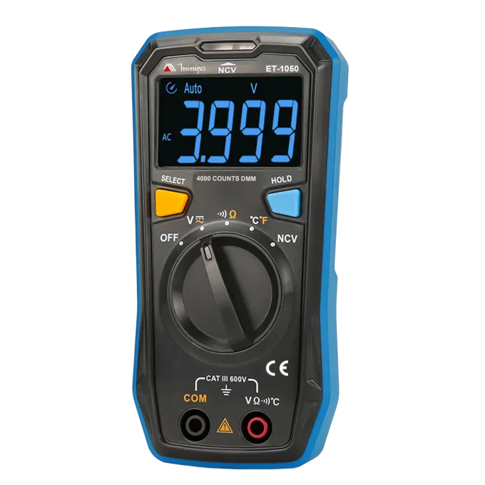 O multímetro digital modelo ET-1050 diferencia-se por possuir design compacto para as atividades, display EBTN que traz maior visibilidade de leitura em ambientes de maior luminosidade e alarme indicador áudio visual, além de funções como tensão AC/DC, resistência, continuidade, temperatura, função NCV e data hold.