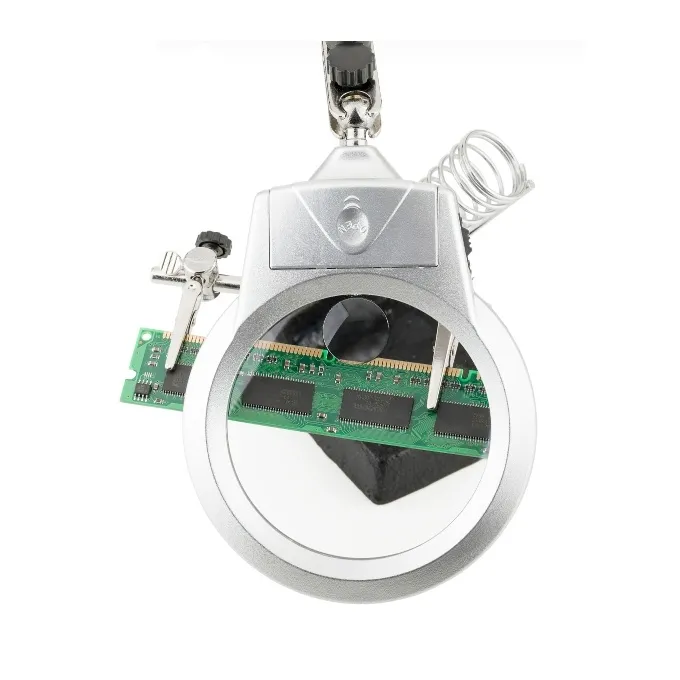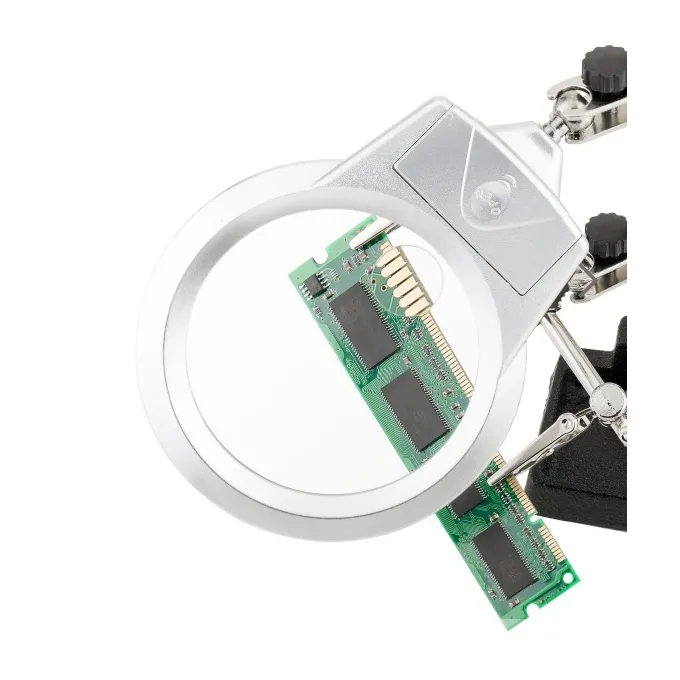Lupa de Mesa SLP-100 LED com Garras e Suporte para ferro de soldar é uma ferramenta multifuncional que foi desenvolvida para auxiliar os profissionais de eletroeletrônica nos trabalhos de soldagem, serviços de manutenção e reparos de placas eletrônicas.